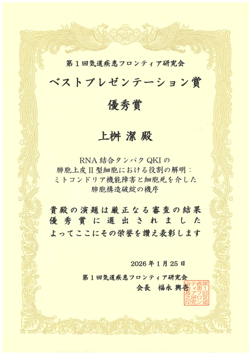「RNA結合タンパクQKIの肺胞上皮Ⅱ型細胞における役割の解明:ミトコンドリア機能障害と細胞死を介した肺胞構造破綻の機序」を発表し、ベストプレゼンテーション 優秀賞 を受賞しました。これまでの研究が評価された結果です。おめでとうございます。